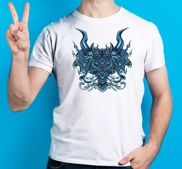 Referință: T4806Această grafică impresionantă prezintă o creatură cu hornuri, proiectată cu detalii complexe în nuanțe de albastru închis. Ilustrația detaliată evidențiază o fuziune de elemente fioroase, fiind ideală pentru cei care caută un aspect unic și puternic. Perfectă pentru a face o declarație cu stilul său dramatic.