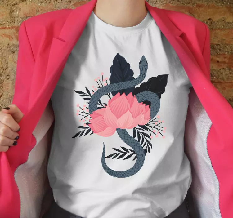 Designul grafic al acestui Alt tricou cu motiv de șarpe și floare este o combinație unică de elemente naturale, incluzând un șarpe stilizat, flori de lotus și frunze delicate, toate îmbinate într-un stil modern, cu nuanțe de roz și negru, ce evocă frumusețea naturii într-o formă artistică.