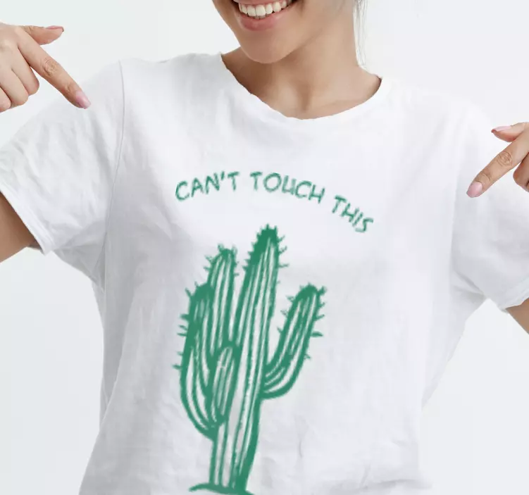 Referință: T4734Acest design jucăuș prezintă un cactus cu expresia 'Can't Touch This' deasupra. Culoarea verde vibrant contrastează frumos cu țesătura albă, creând o piesă amuzantă perfectă pentru îmbrăcămintea casual. Ideal pentru cei care apreciază umorul și stilurile unice.