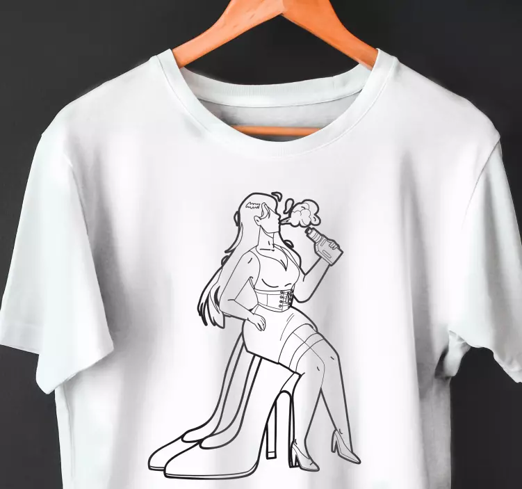 Descoperiți Alt tricou cu vibe elegant de pantofi cu toc, un produs care îmbină cu măiestrie un design grafic atrăgător ce ilustrează o femeie cu o siluetă fermecătoare, desenată de mână, evidențiind pantofii cu toc într-o schiță elegantă. Această ilustrare captivantă reflectă stilul de viață modern, cu un aer de fumat și vape, perfectă pentru orice iubitoare de modă care își dorește să strălucească la un cocktail.