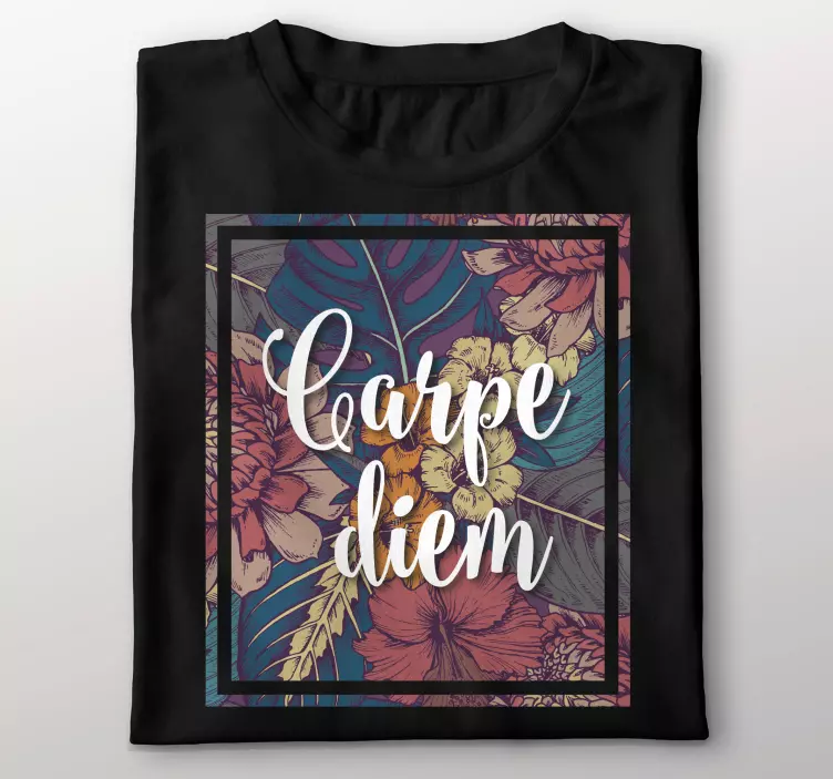 Referință: T4902Acest design vibrant prezintă expresia 'Carpe Diem' împletită cu elemente florale colorate. Fundalul negru evidențiază nuanțele îndrăznețe și vesele, creând o experiență vizuală uplifting. Perfect pentru cei care apreciază un amestec de frumusețe și exprimare motivațională.