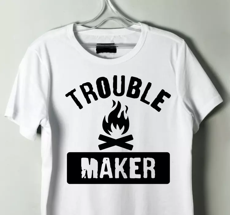 Referință: T5448Acest design atrăgător prezintă un text îndrăzneț cuvintele 'Trouble Maker', însoțit de simboluri de flacără și foc de tabără. Este perfect pentru cei care îmbrățișează un spirit jucăuș și aventuros. Contrastul dintre negru și alb adaugă un element de entuziasm și captează atenția fără efort.