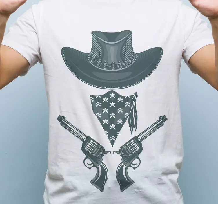 Referință: T4193Acest design impresionant prezintă o pălărie de cowboy, revolvere încrucișate și o bandană cu model de craniu dedesubt. Elementele îmbină teme clasice western cu motive de pirat, făcându-l o piesă unică, perfectă pentru evenimente tematice sau îmbrăcăminte jucăușă.