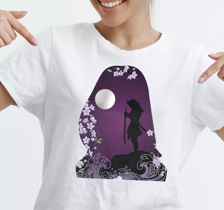 Referință: T4771Această piesă elegantă prezintă o siluetă de războinic în mijlocul florilor de cireș și a unei luni pe un fundal vibrant de mov. Elementele florale adaugă o notă de eleganță, făcând-o perfectă pentru persoanele expresive care apreciază arta în garderoba lor.