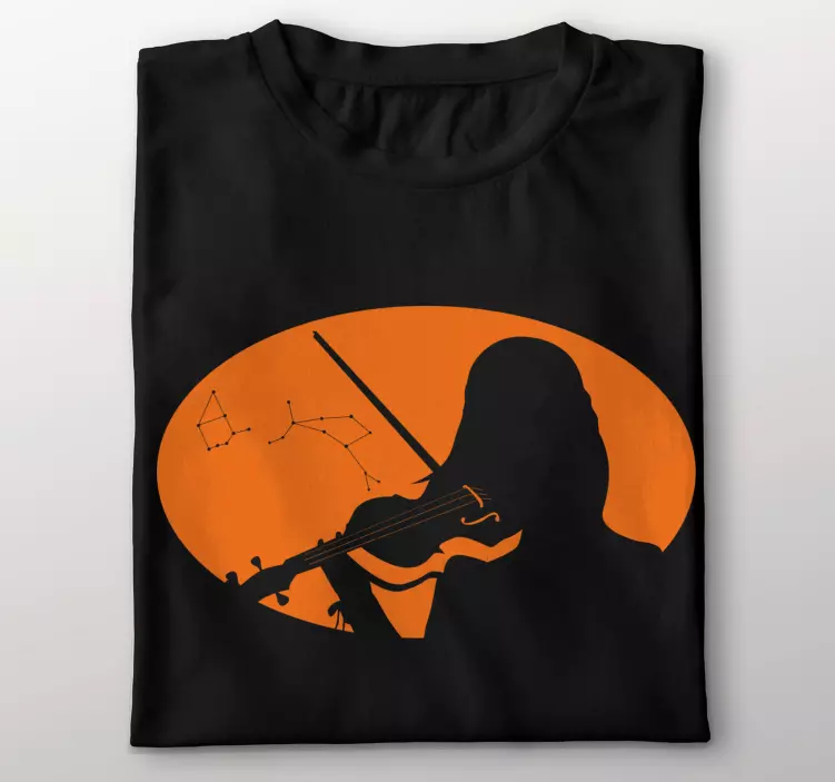 Designul grafic al acestui Alt tricou violinist sub stele îmbină armonios elemente precum vioara, silueta unui violonist, muzica clasică și constelațiile, toate acestea fiind ilustrare perfectă a pasiunii pentru muzică. Fundalul negru subliniază frumusețea și intensitatea culorilor portocalii, creând o atmosferă magică și captivantă.