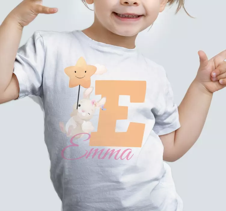 Referință: T4701Acest design fermecător prezintă un iepuraș vesel care ține în mână un balon în formă de stea, însoțit de litera 'E' și un nume personalizat. Perfect pentru ocazii speciale, radiază bucurie și jucăușenie, făcându-l o alegere ideală pentru cei mici.