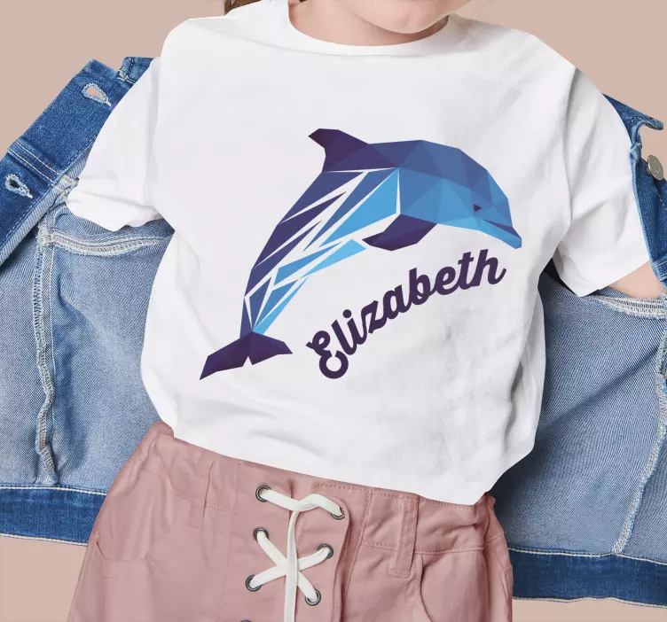 Referință: T4981Acest design vibrant prezintă un delfin geometric stilizat, simbolizând joaca și bucuria. Numele centrat dedesubt adaugă o notă personală, făcându-l perfect pentru copii mici. Culorile reci de albastru îmbunătățesc aspectul viu, făcându-l potrivit pentru diverse ocazii casual.