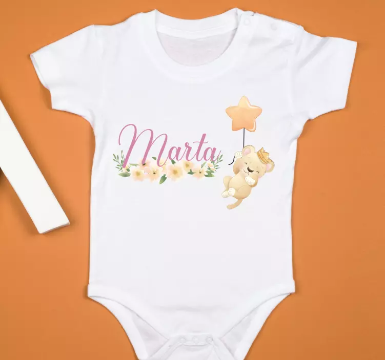 Referință: T5219Acest design fermecător prezintă un ursuleț drăguț care ține un balon în formă de stea, completat de elemente florale delicate. Numele 'Marta' este integrat elegant în lucrare, creând o notă veselă și personalizată, perfectă pentru îmbrăcămintea de bebe.