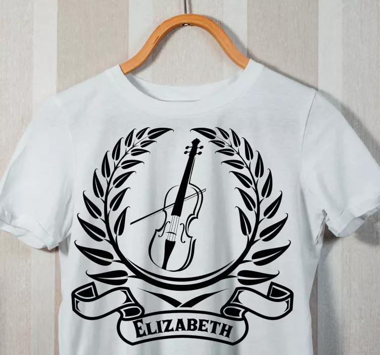 Referință: T4492Acest design unic prezintă un violoncel în centrul său, înconjurat de o coroană de lauri. Numele 'Elizabeth' este prezentat elegant pe o panglică sub emblemă, semnificând o notă personală. Schema de culori monocromă subliniază natura clasică și rafinată a temei.