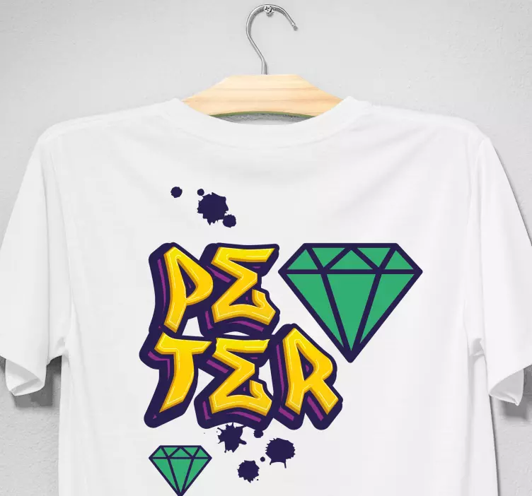 Referință: T5428Acest design vibrant prezintă numele 'Peter' în litere îndrăznețe și stilizate, alături de un grafic cu un diamant verde. Elementele jucăușe includ stropi colorate, sporind vibrația contemporană. Perfect pentru îmbrăcăminte casual, combină o artă unică cu o notă personală.