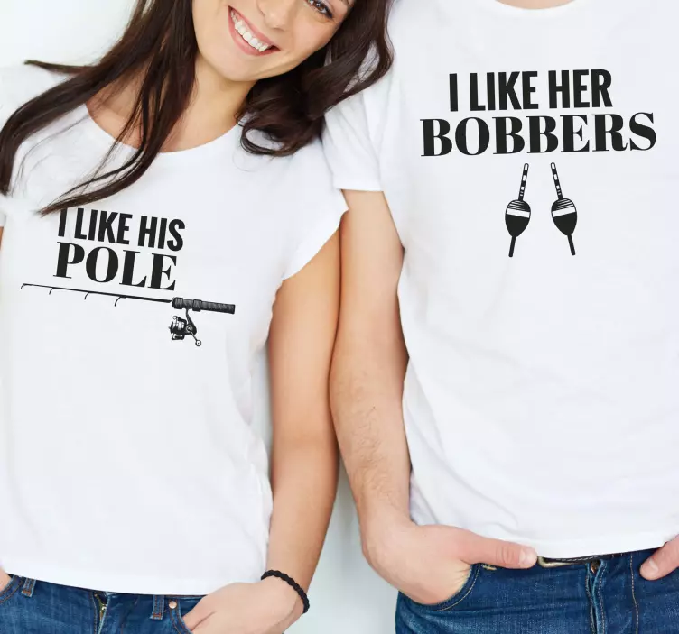 Referință: T5280Această imagine prezintă un cuplu purtând tricouri jucăușe cu citate umoristice legate de pescuit. Fiecare tricou evidențiază fraze istețe, combinând distracția și farmecul, perfecte pentru cuplurile care se bucură de pescuit împreună. Designul adoptă o temă jucăușă care cu siguranță va amuza atât purtătorii, cât și privitorii.