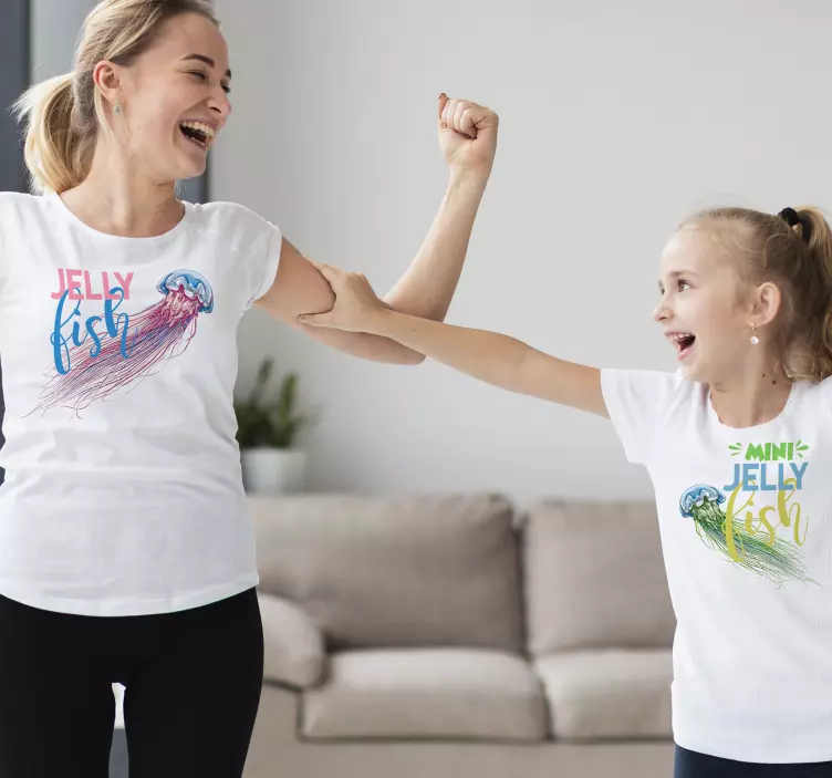 Referință: T5235Această imagine plină de viață surprinde o mamă și o fiică împărtășind momente de bucurie, ambele îmbrăcate în bluze asortate cu imagini vibrante de meduze. Designul jucăuș evidențiază legătura lor și creează o atmosferă distractivă și colorată, perfectă pentru a exprima dragostea și unitatea.