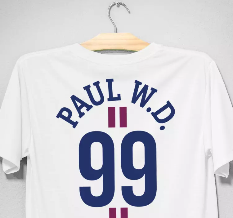 Designul are un customnmae albastru închis cu inițialele celorlalte nume ale tale. Numărul de pe spatele tricoului este 99 și are două dungi decorative violet în partea de sus și de jos.